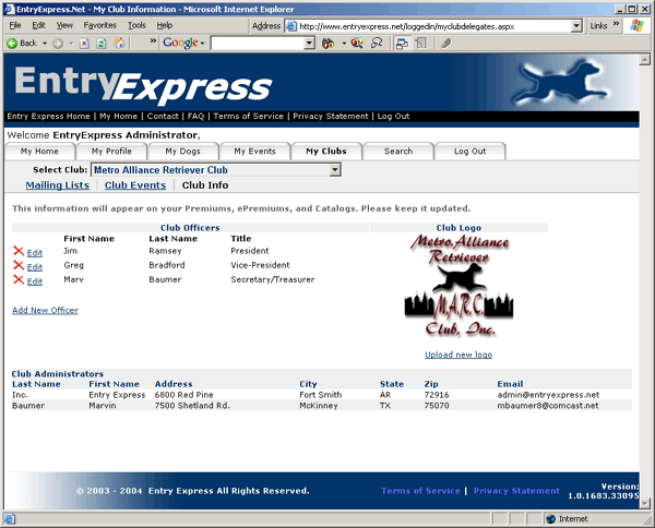 Set up your club, officers, and logo. Club Administrators are listed at the bottom. A club can have multiple administrators.